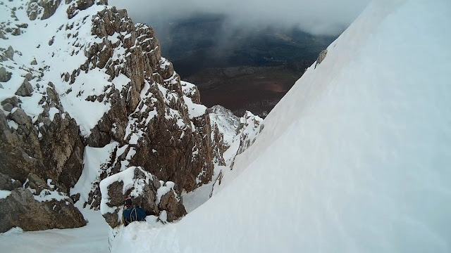 Durante la progressione sfondiamo un po’ ma le pendenze sono ancora tranquille, si viaggia intorno ai 35,40° fino a raggiungere la sella su inclinazioni più accentuate. Di tanto in tanto nubi ovattate drappeggiano il cielo lasciando intravedere sprazzi d'azzurro. L’imbocco del canale ora si trova davanti a noi semi nascosto dalla foschia. Allora si cambia assetto, via bastoncini, fuori casco, imbrago, piccozze e ramponi. Tiriamo fuori anche il guscio perché il vento in questo punto si fa sentire.